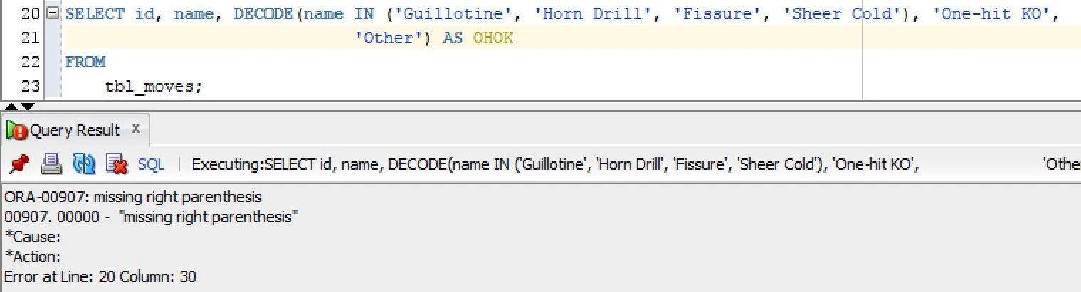In the query above, I selected rows from tbl_moves by looking at the id and name column value as is and then use DECODE function to translate the values in name according to the search expressions in DECODE, which in this case looks at only four moves but could have easily been expanded to translate, or decode, all of the Pokémon moves.